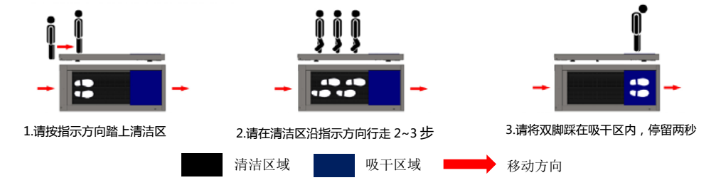 如圖中箭頭所示,使用人員從感應(yīng)器一方通過(guò),在清潔區(qū)域站立停留2- 3秒,此時(shí)刷浸水循環(huán)自行清潔并清潔鞋底;再通過(guò)吸干區(qū)停留1- 2秒經(jīng)過(guò)強(qiáng)力吸水棉,把鞋底水漬吸干后走下設(shè)備,完成整個(gè)清洗過(guò)程。如停留時(shí)間適當(dāng)增加,清潔效果更好。(如果置于風(fēng)淋室內(nèi),則不影響進(jìn)入時(shí)間,因風(fēng)淋室風(fēng)淋時(shí)間一般在10秒左右)。